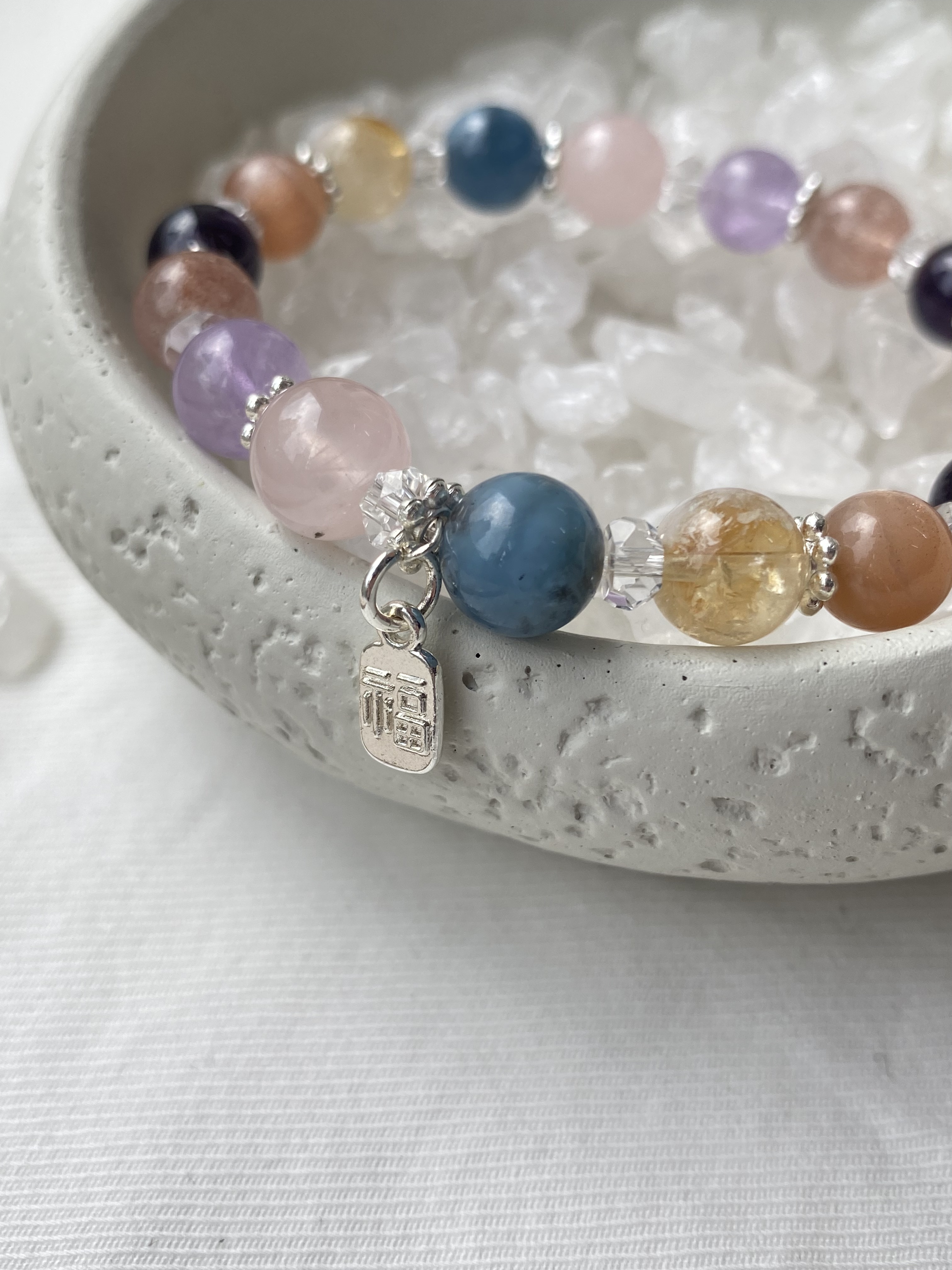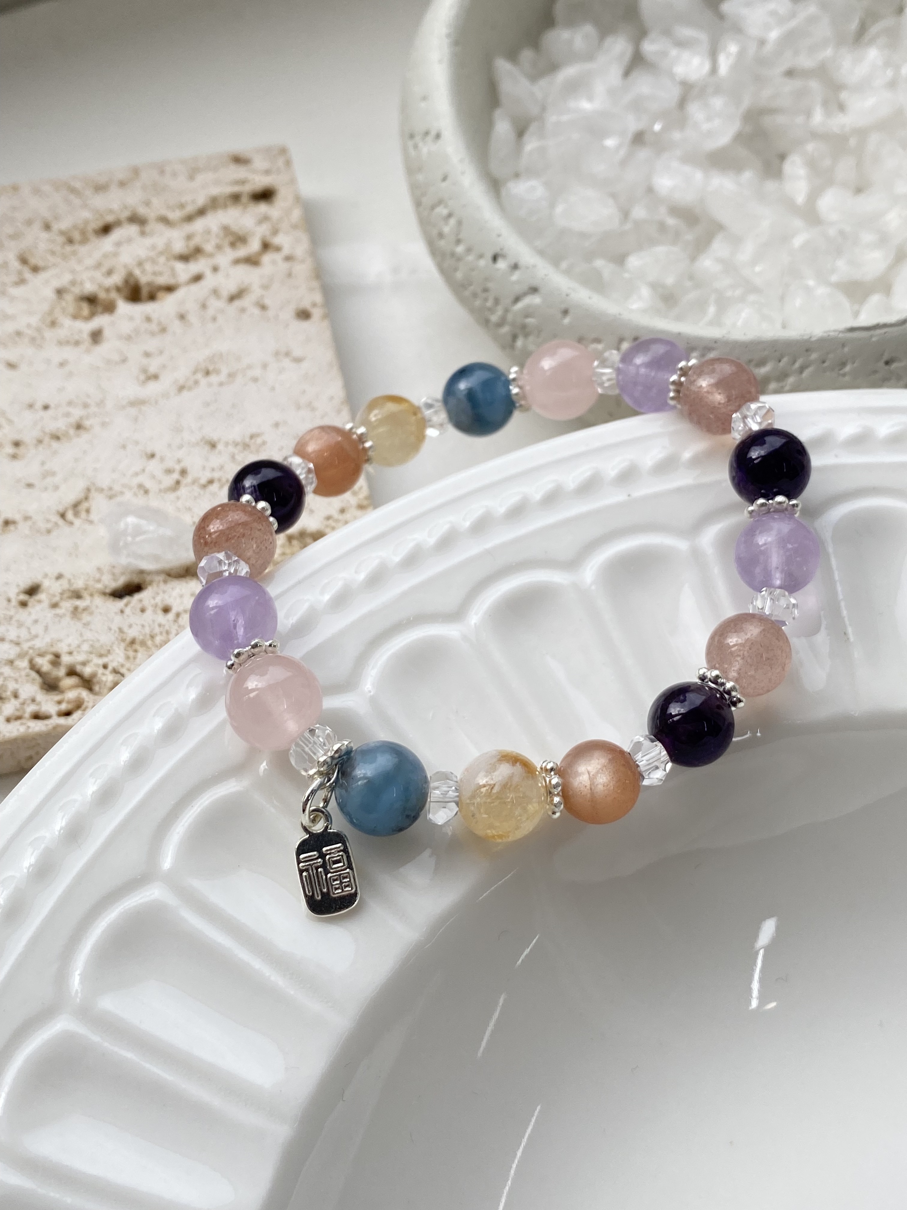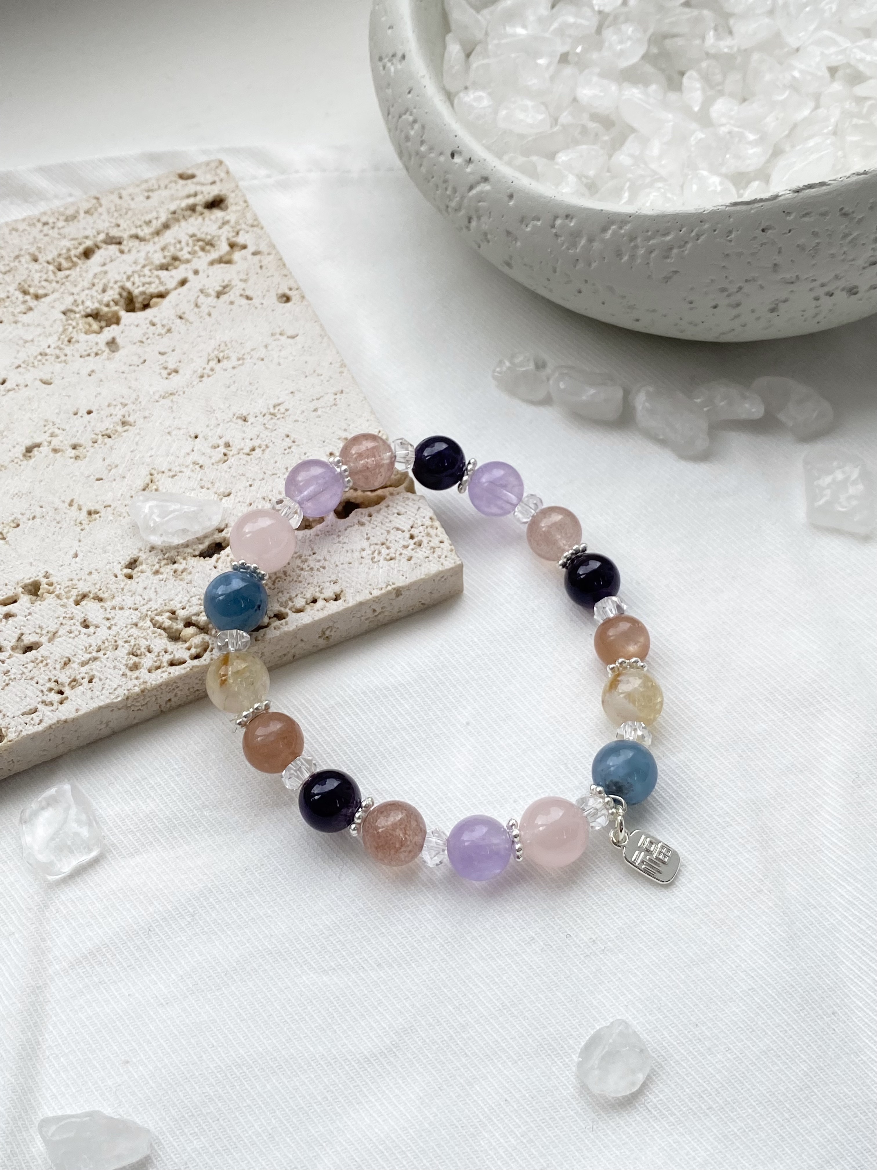 材質: 雲霧薰衣草紫水晶 / 棉絮深色紫水晶 / 雲霧草莓粉晶 / 雲霧黑點海藍寶 / 雲霧黃塔晶 / 貓眼橙月光 / 白水晶
