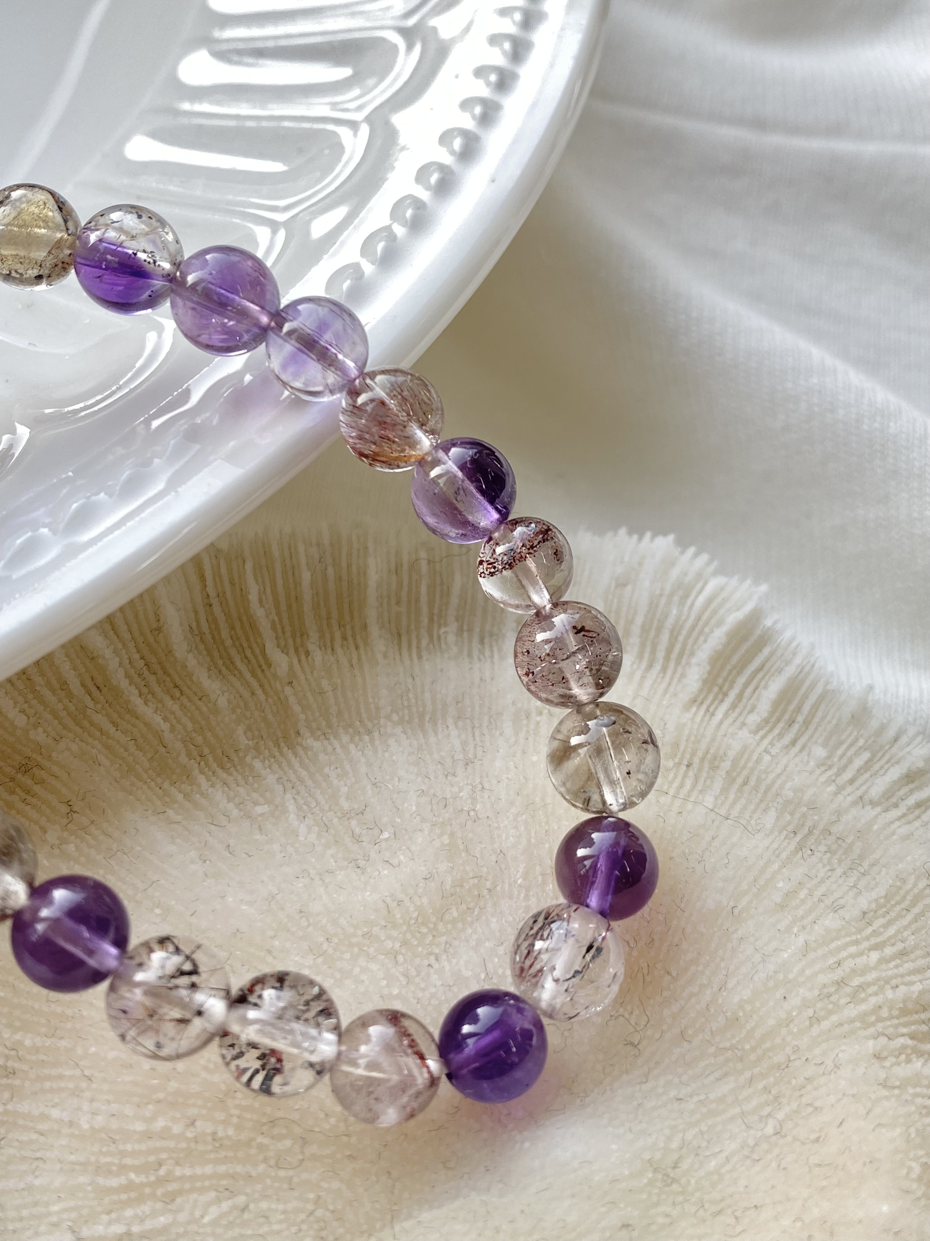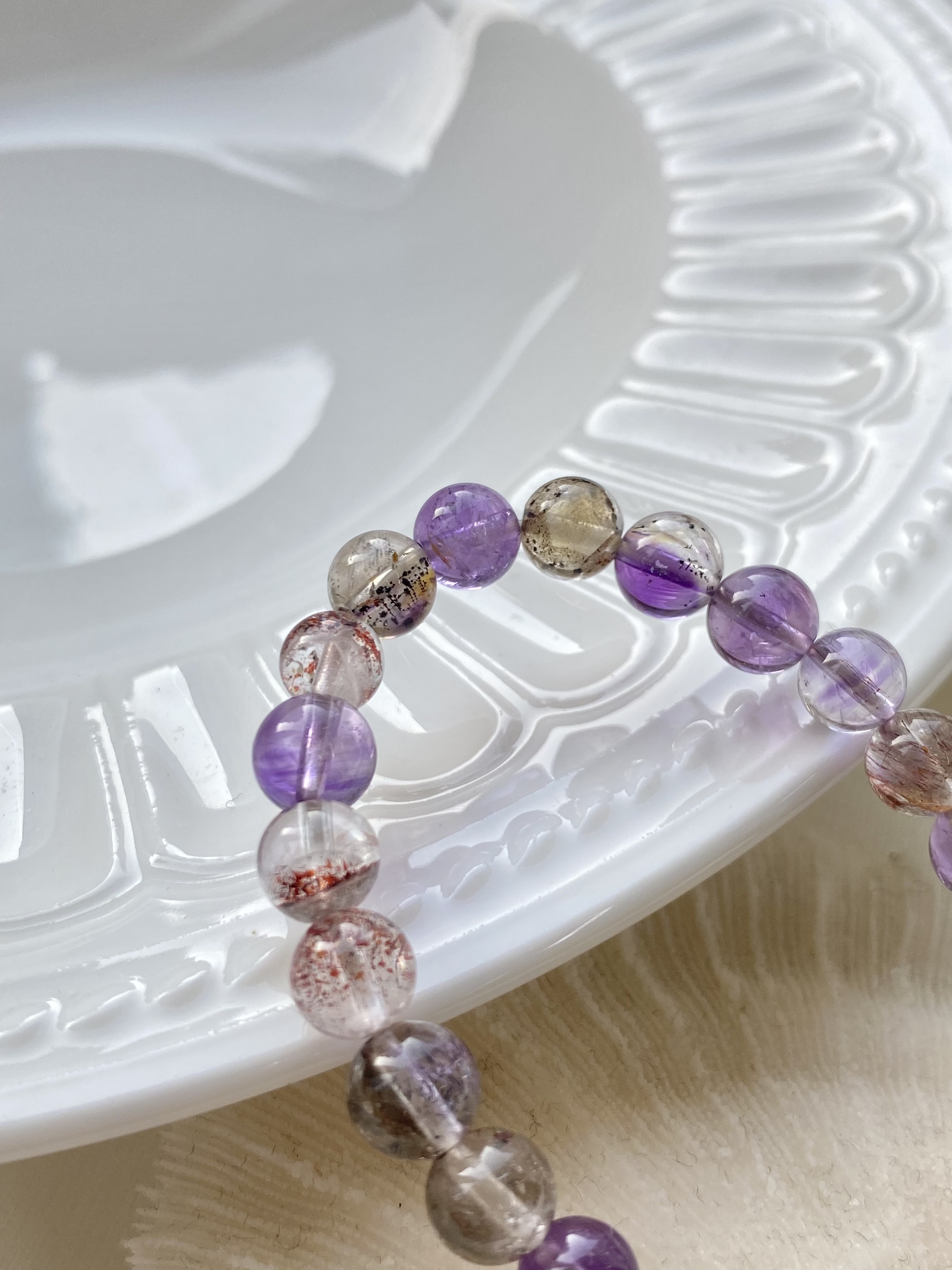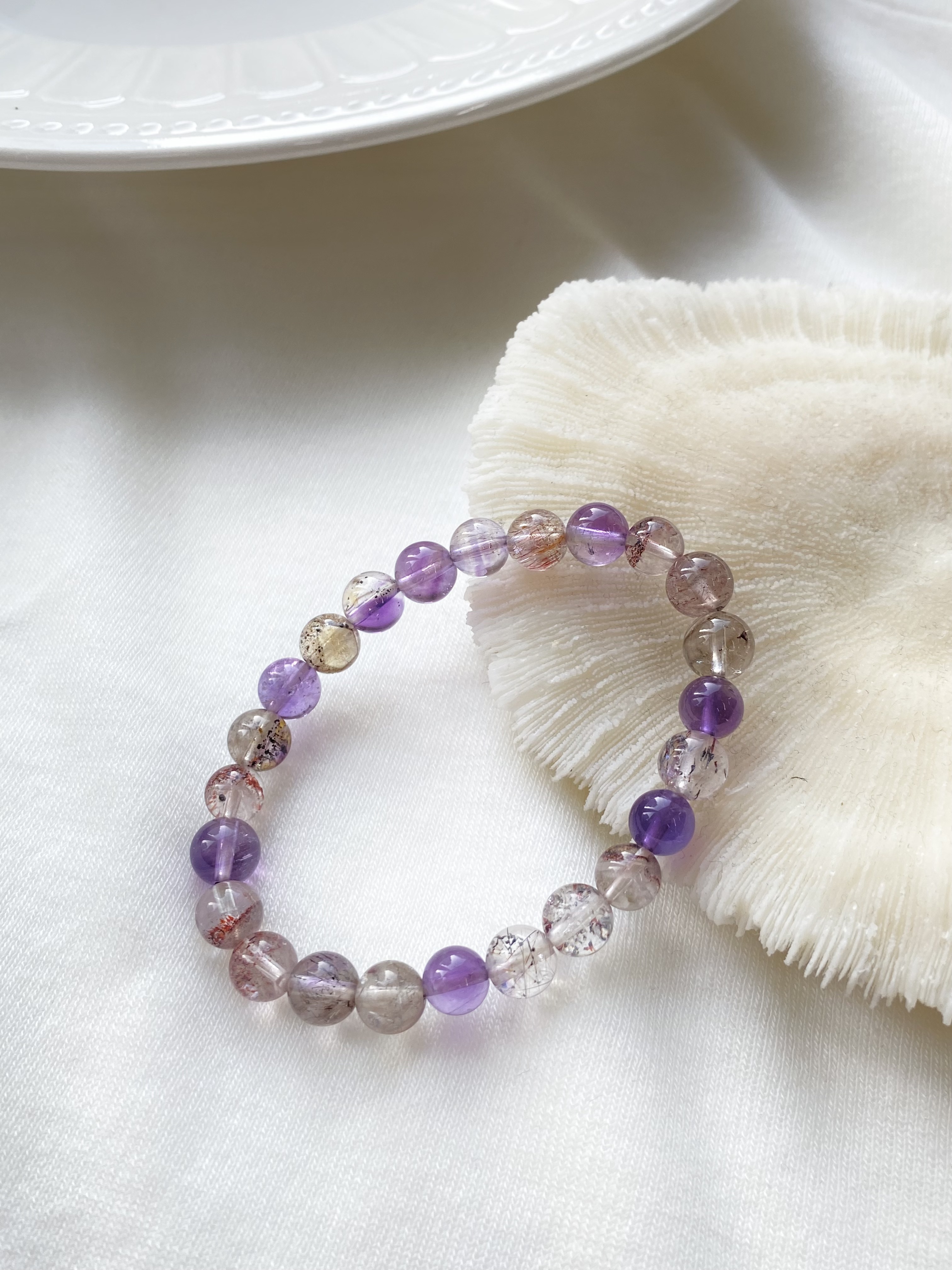 紫水晶、茶晶、白水晶、金紅石、針鐵礦、纖鐵礦、黃磷鐵礦。因為融合多種能量,所以被稱為「靈性水晶之王」。