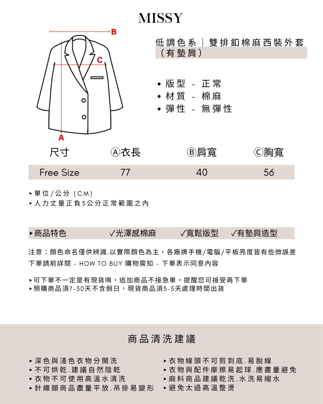 ▸此款是『預縮處理的棉麻材質』洗過後會再縮2-3公分是正常的,熨燙機整燙過後就不會皺~
