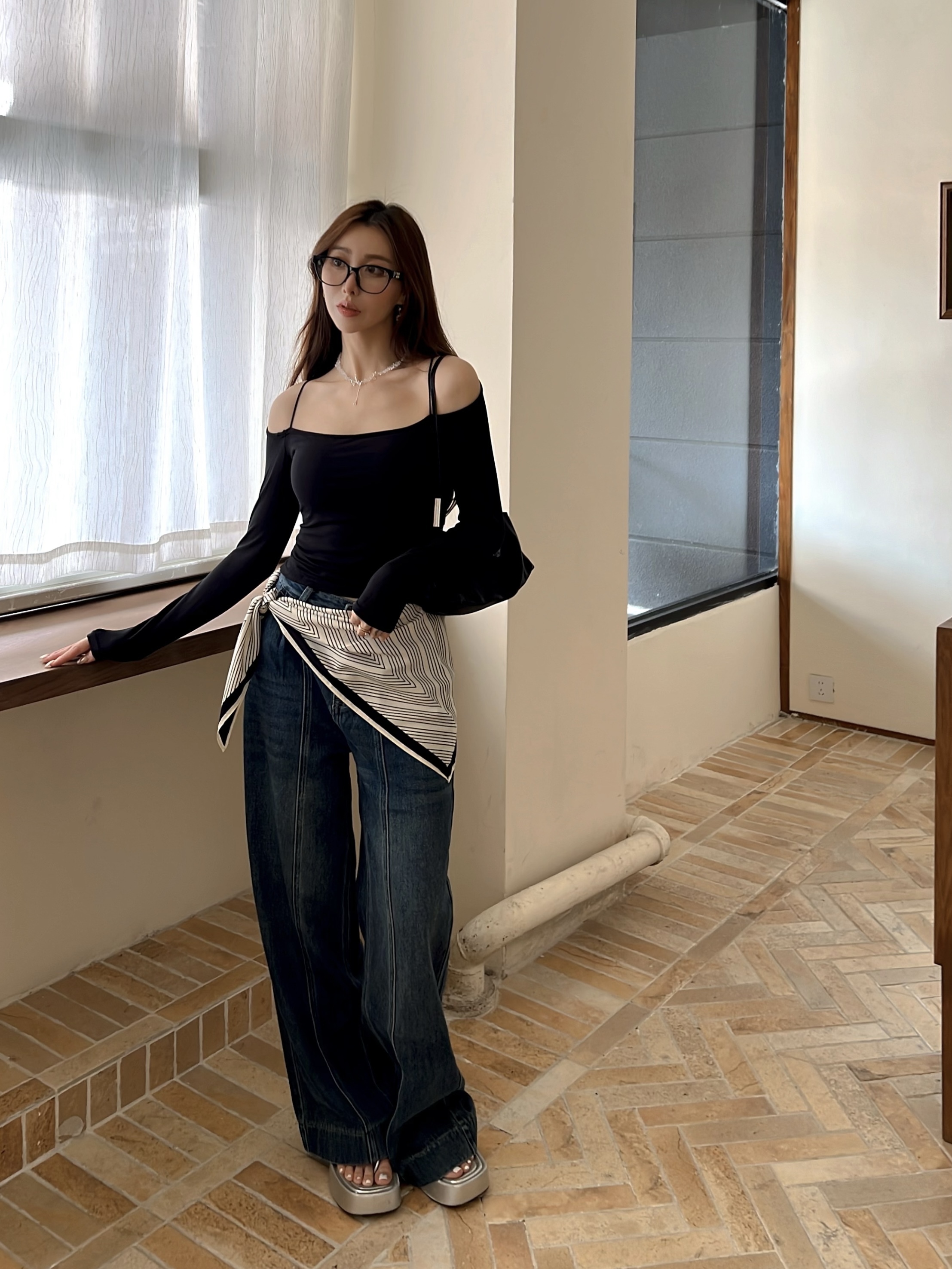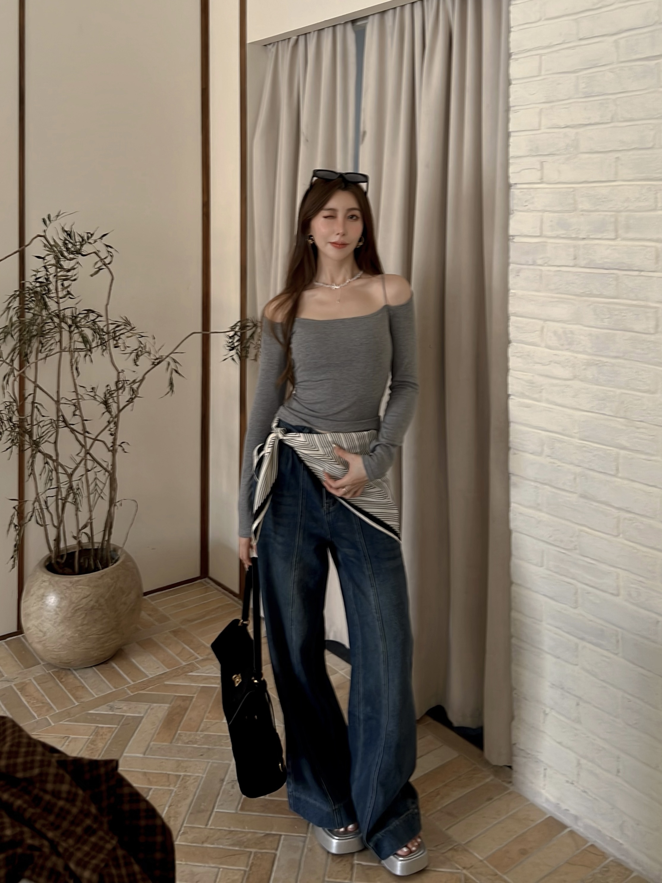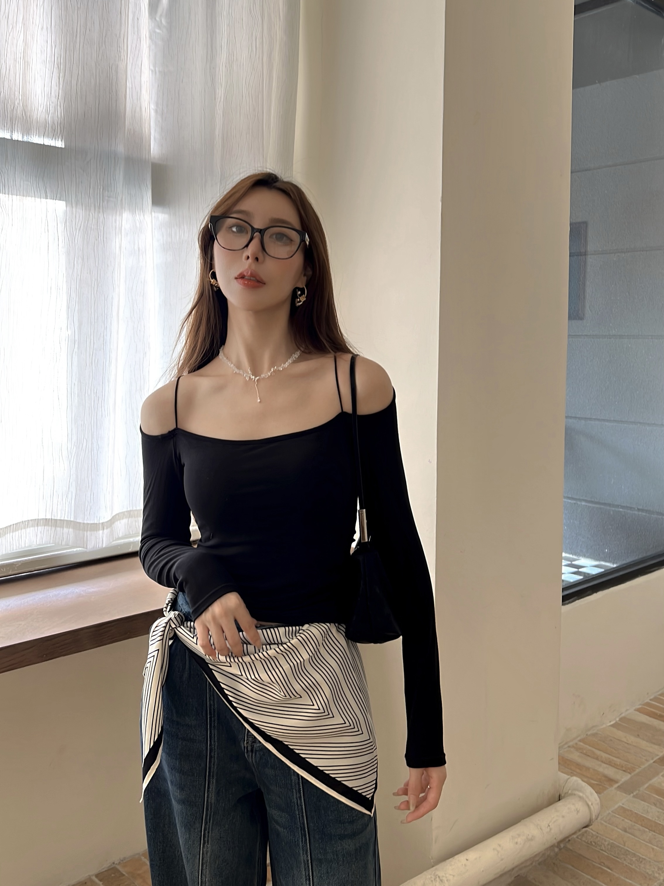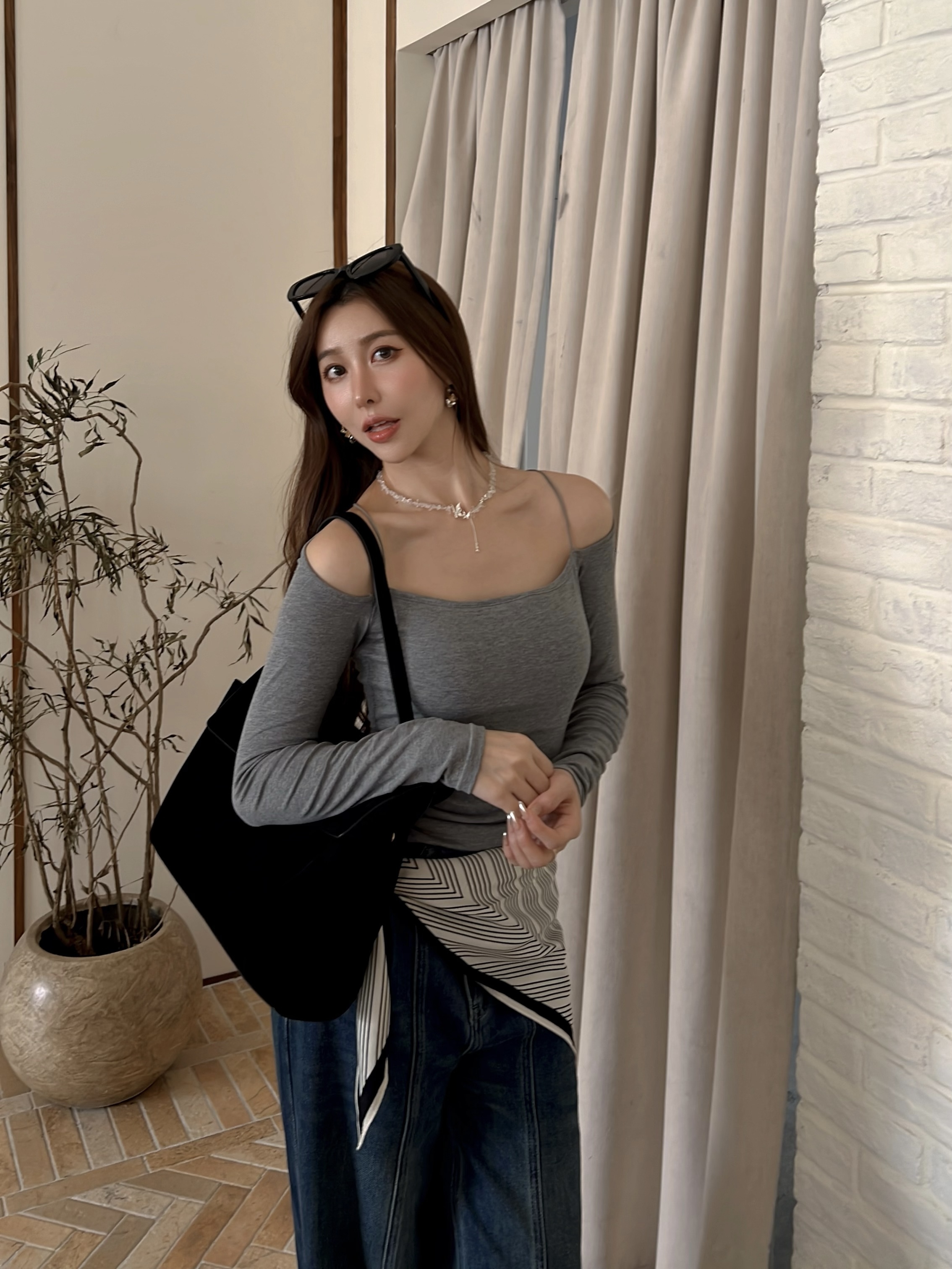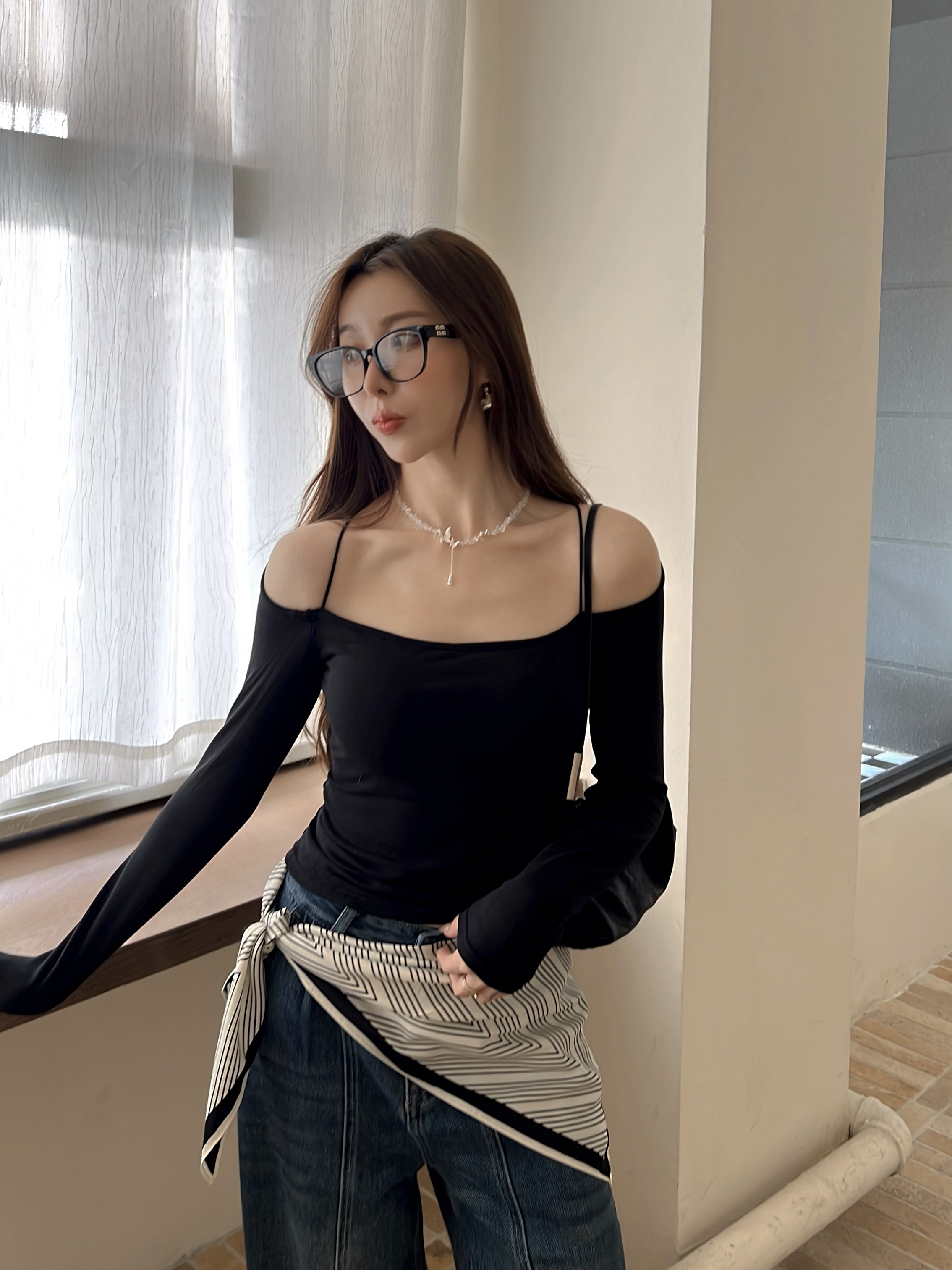 細肩帶長袖 ➝ 微辣露肩感,增添慵懶魅力